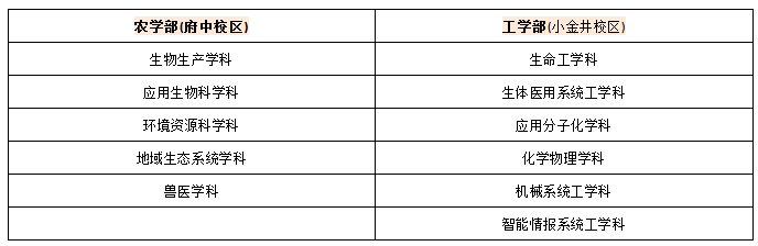 东京农工大学共有两个学部,农学部与工学部。农学部设有5个学科,工学部设有6个学科。由于每个校区所设置的学科不同,请大家报考时多注意查看。