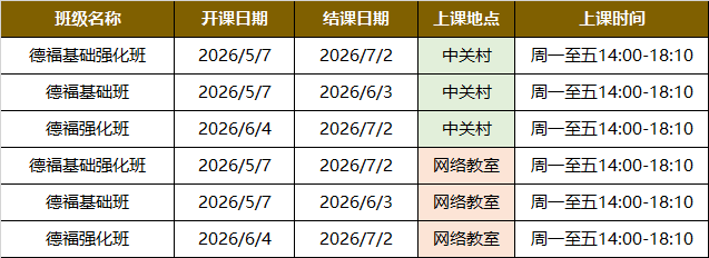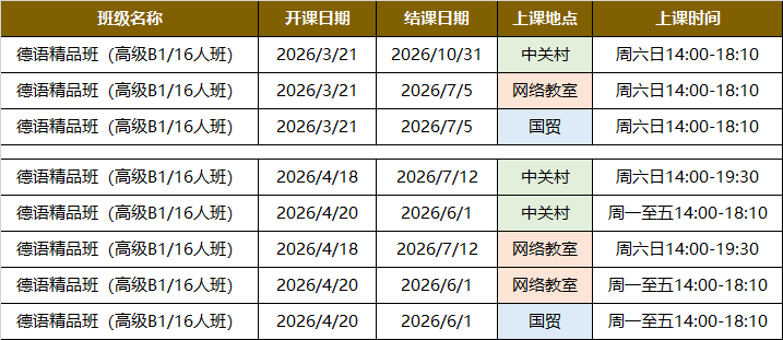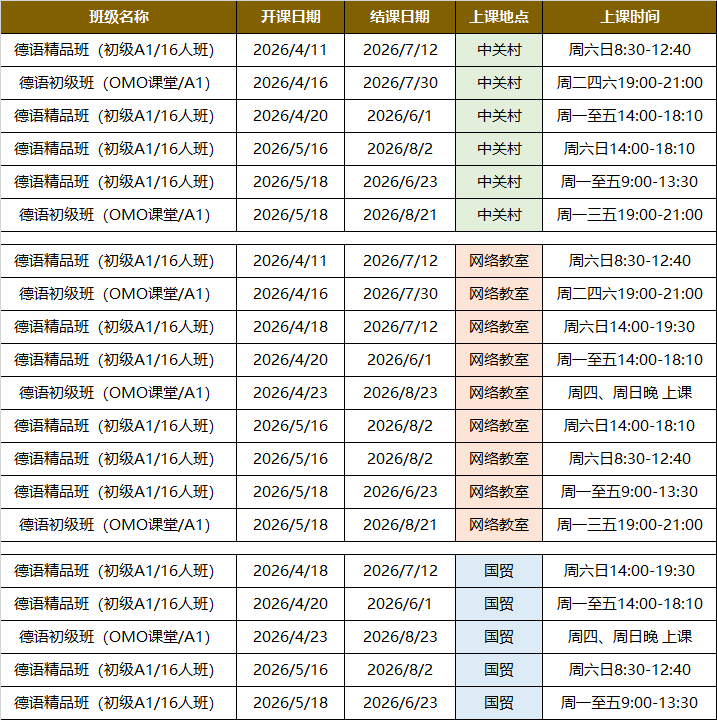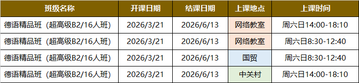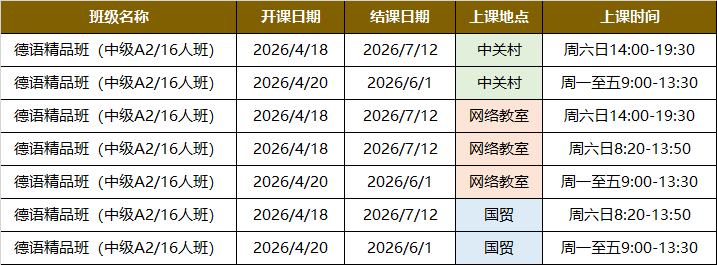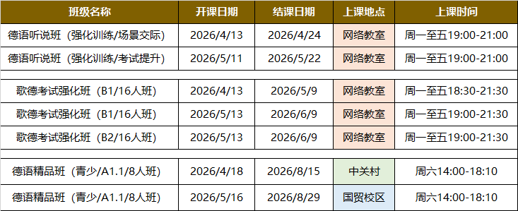 天气越来越暖,春季也已悄然而至,也正是时候,让你的德语能力也跟着一起发芽生长啦!我们为2026年的春季准备好了热腾腾的德语学习“菜单”!从入门到精通,各级别的春季班课表已经全部出炉,就等你来挑一款,为自己充充电。