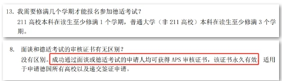 审核大大提前:211高校学生修满1学期,非211高校学生修满3学期,即可报名参加德适考试(TestAS)替代传统面试,从而提前获得APS证书。