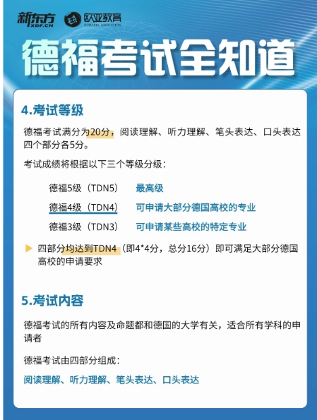 德福考试按照成绩划分为三个等级:TDN 3、TDN 4 和 TDN 5。其中,TDN 3 代表考生具备基本的德语语言能力,能够满足在德国进行一般性学习和生活的基本需求;TDN 4 表示考生具备较好的德语水平,可以顺利完成德国大学的本科专业学习;TDN 5 则意味着考生拥有非常高的德语能力,能够轻松应对德国大学硕士及以上层次的学术研究和专业交流。一般来说,申请德国大学本科通常要求达到 TDN 3 或 TDN 4 水平,而申请硕士及以上学位则大多要求达到 TDN 4 或 TDN 5 水平。