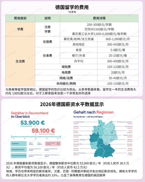 很多小白纠结德国留学,核心顾虑就是花费问题——学费贵不贵?生活费要多少?毕业之后能赚多少?这份攻略一次性帮你拆解清楚,学费+生活费全解析,还有德国各行业薪资水平,让你对德国留学的成本与回报做到心中有数。