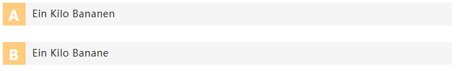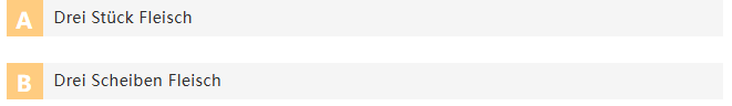- 阴性量词复数变化,如:drei Flaschen Wasser, vier Scheiben Brot;