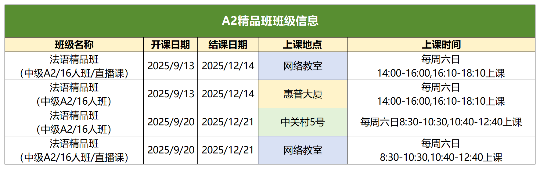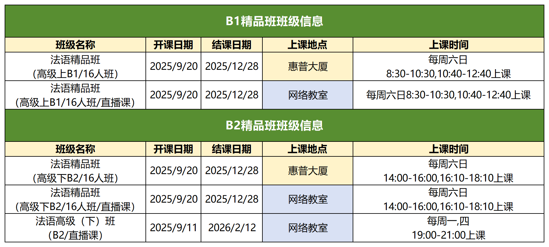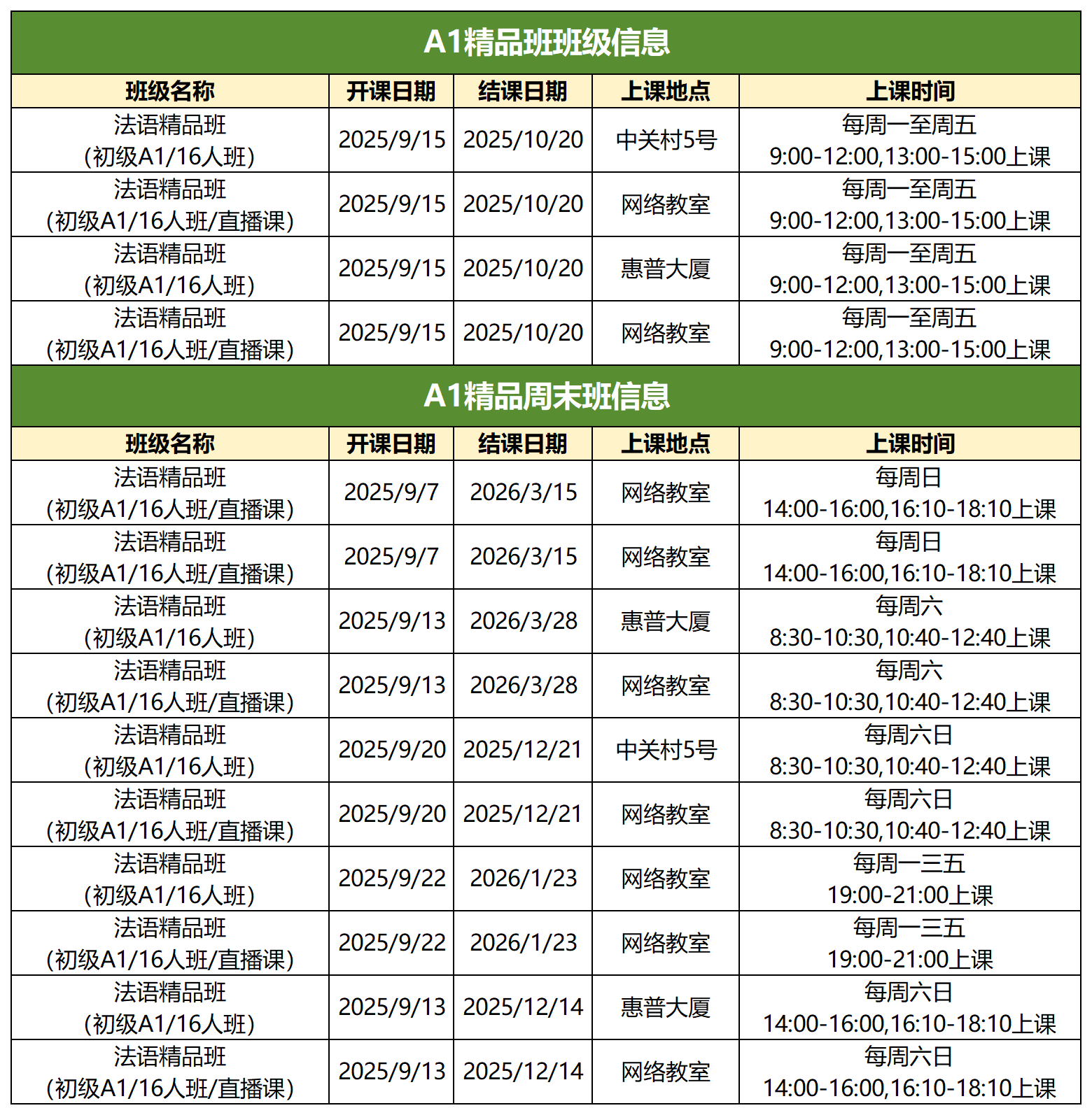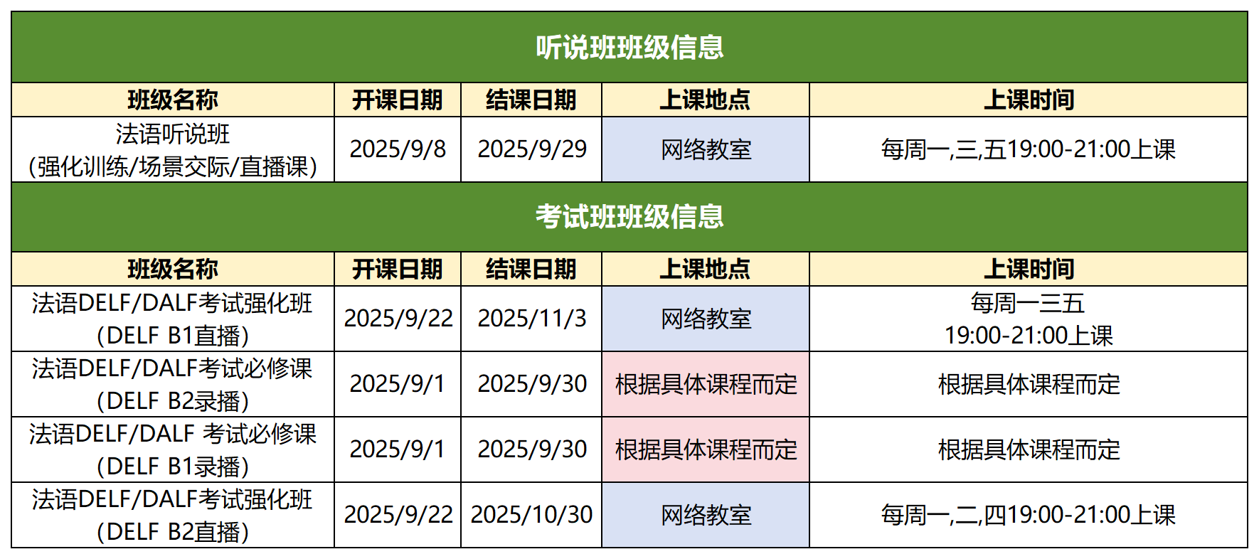 2025年9月新东方法语全级别课表