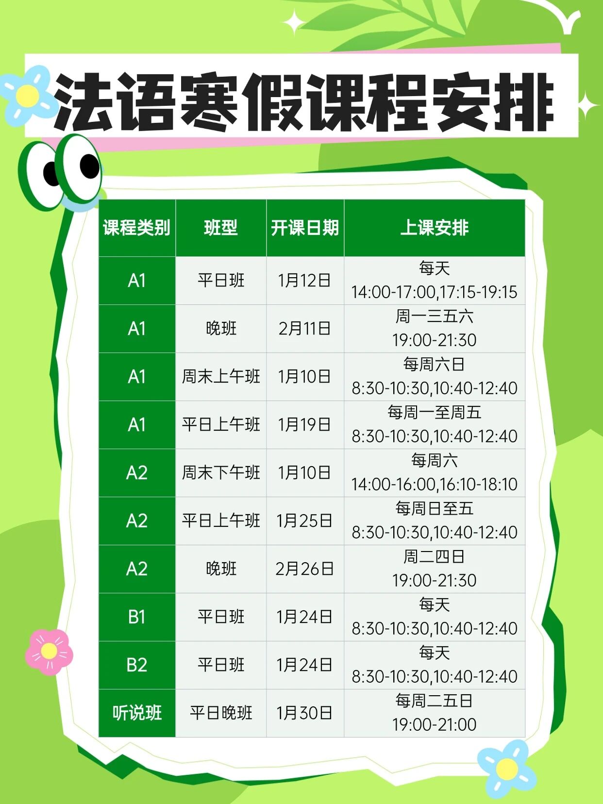 A1基础入门:就在今天,我们的A1平日班正式开课!如果你错过了今天的开班也不要紧,1月19日的平日上午班以及2月11日的晚班正在火热招募中。这个阶段我们将从语音语调开始,带你推开法语世界的大门。
