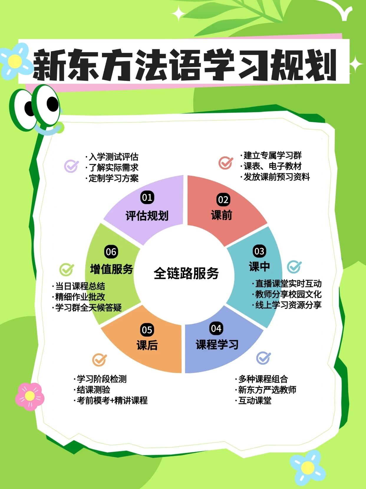 在新东方,学习不仅仅发生在课堂上。我们构建了“评估-课前-课中-课后-增值服务”的全链路学习闭环。