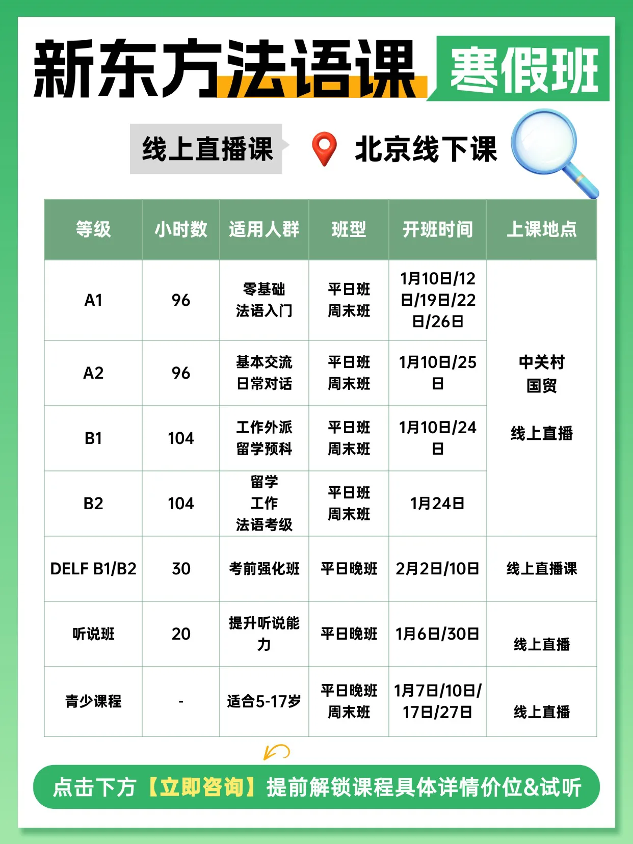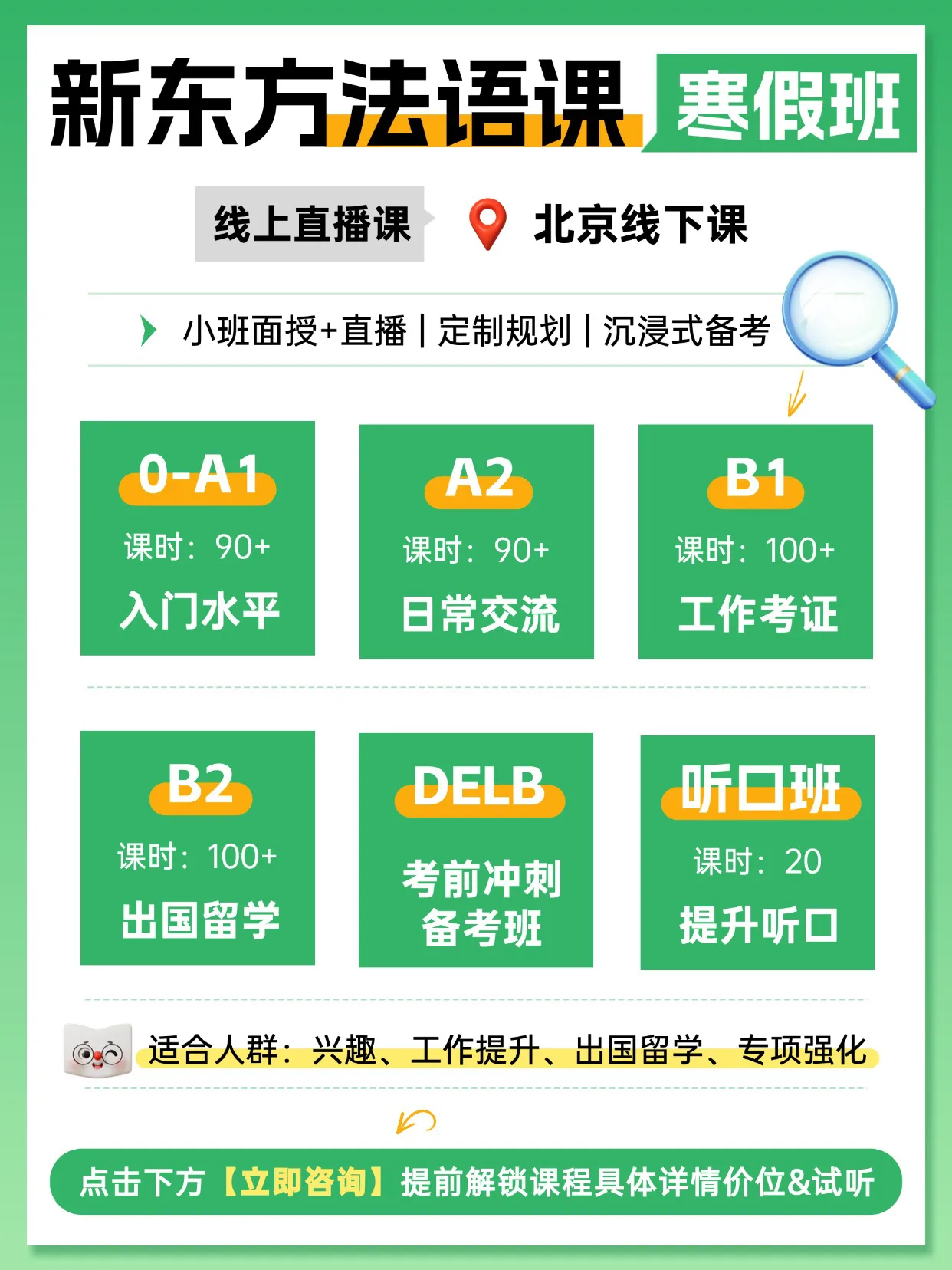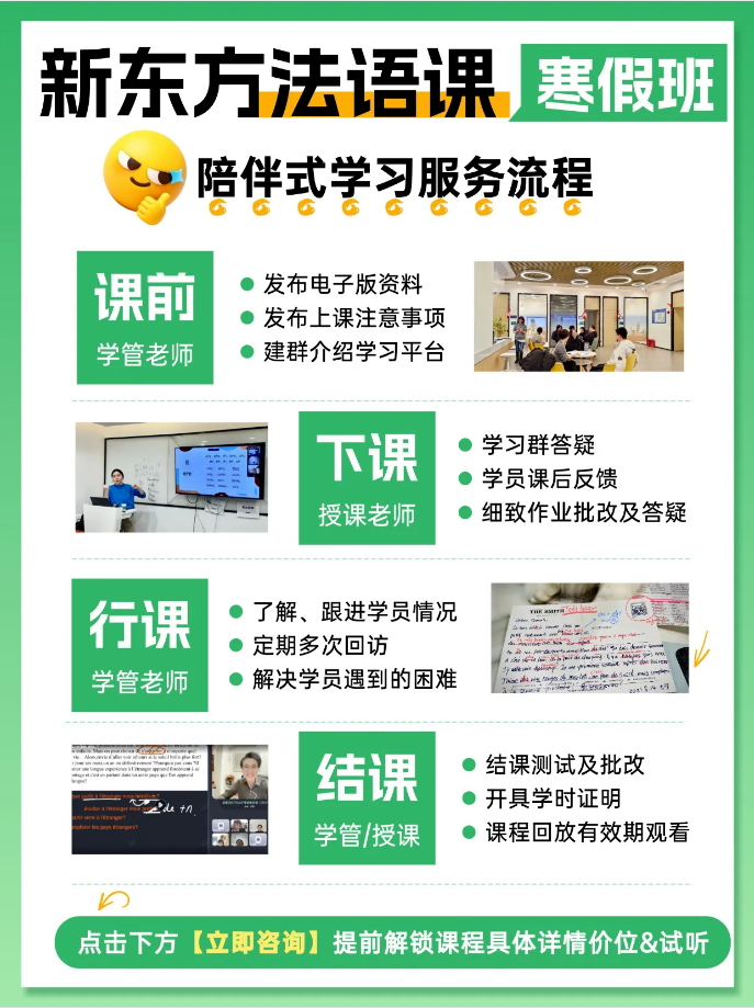 Bonjour!我是新东方的小亚老师。寒假是语言学习的黄金期,无论你是想去法国留学、工作外派,还是单纯对浪漫法语感兴趣,我们都为你准备了全方位的课程方案。从零基础A1到高阶B2,线上线下灵活选择,更有全海归硕博师资团队全程陪伴。拒绝枯燥,沉浸式学法语,这个冬天让我们一起点亮新技能!
