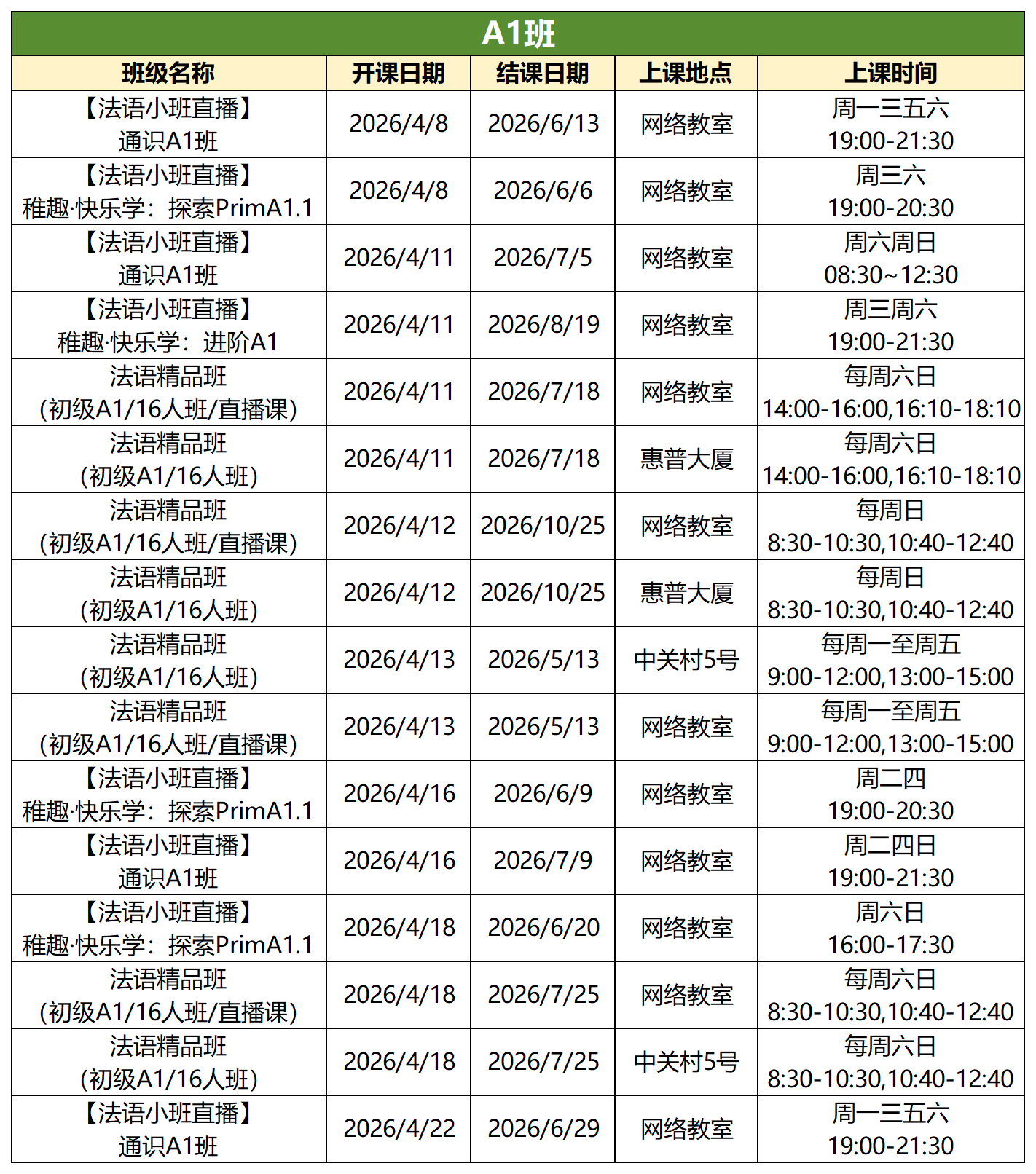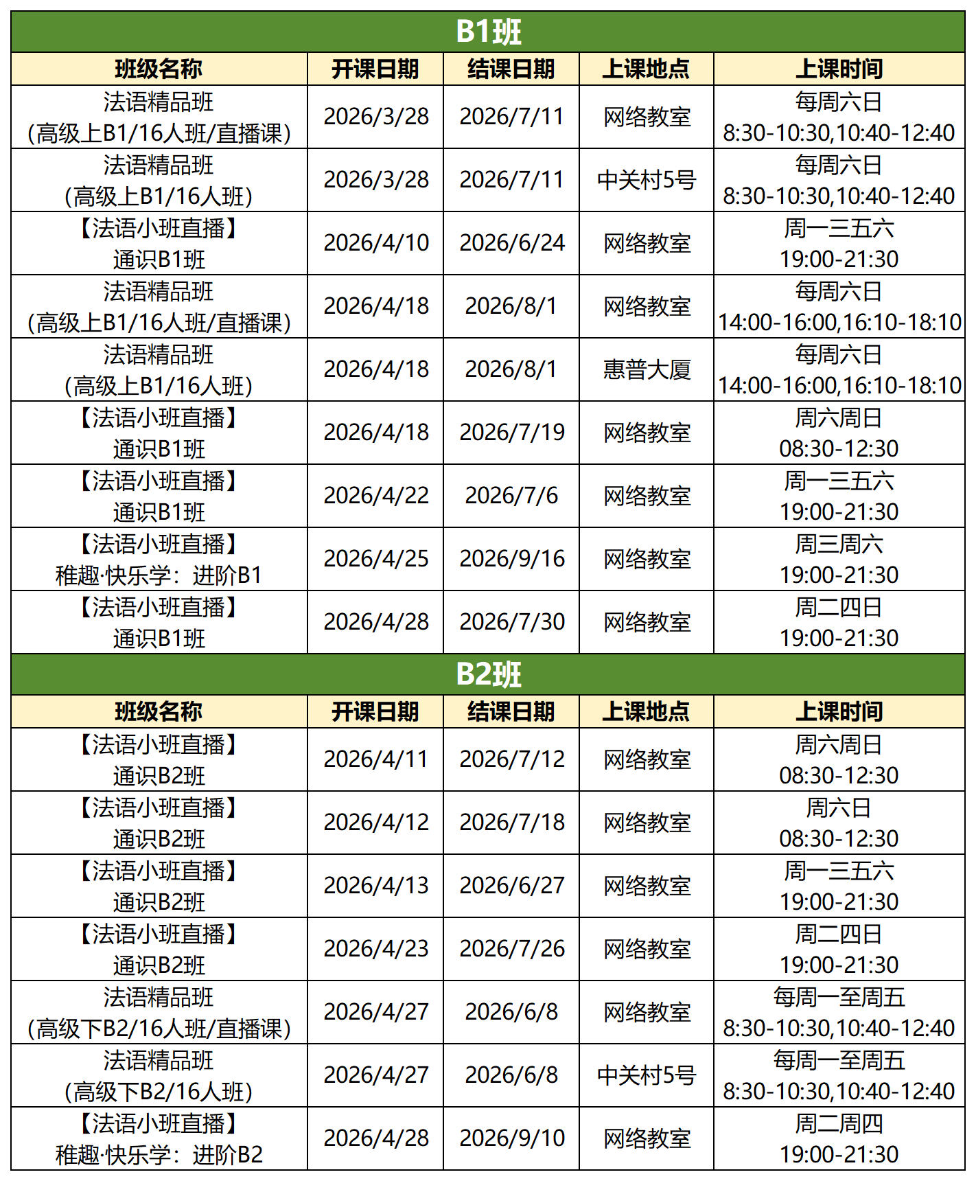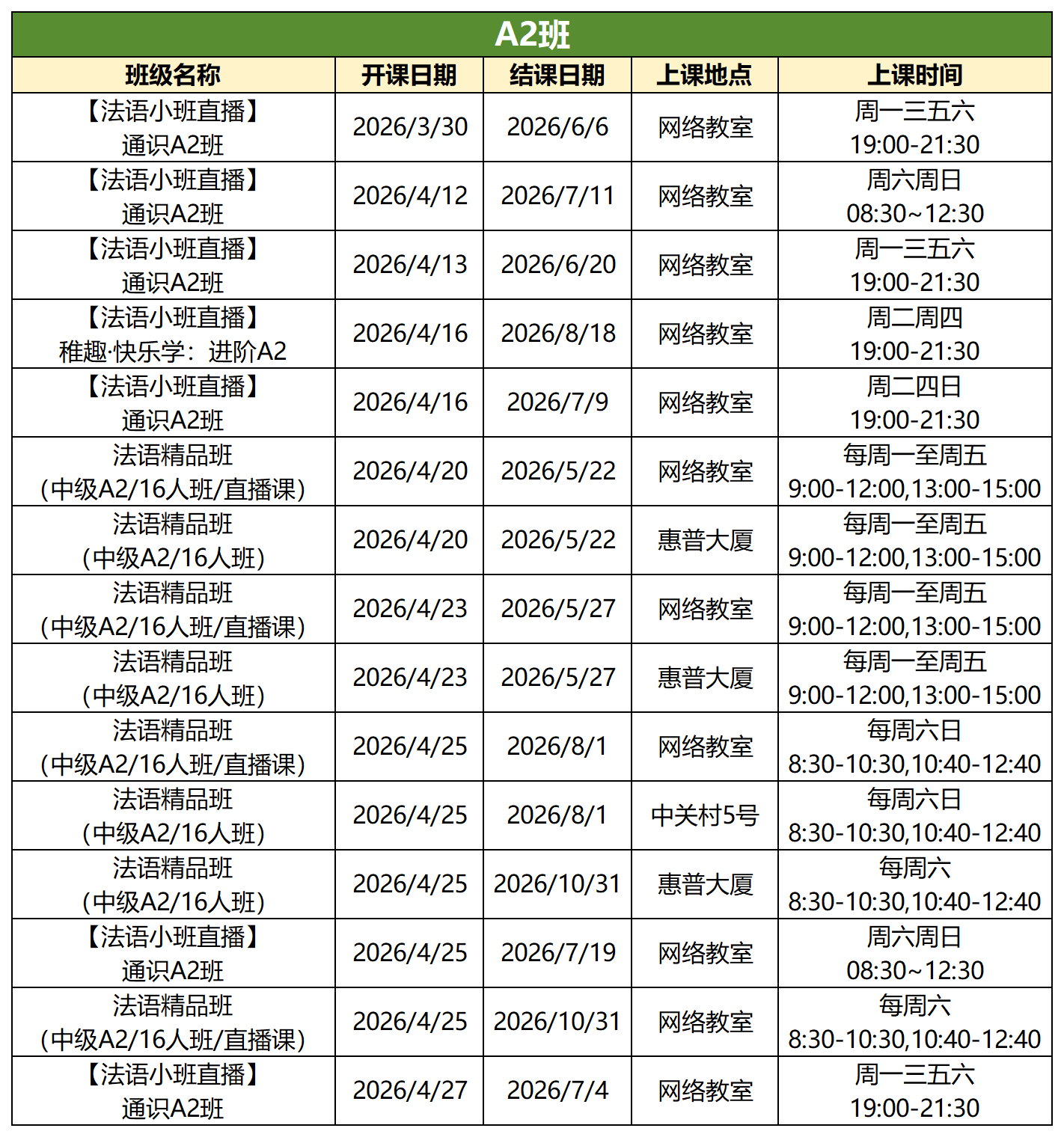新东方法语提供欧标A1-C2基础课程、法语语法,听力口语专项及专四专八、TCF/TEF、DELF-DALF等考试培训。授课形式包含精品班,线上直播课,VIP课程等。下面,由小亚老师为大家提供4月份法语全级别课表,为学习法语提供更多帮助。