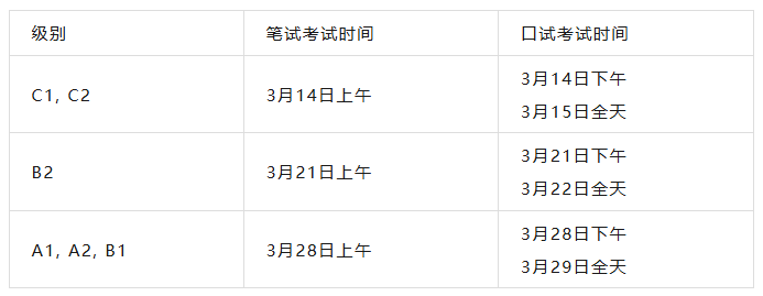 以下是各等级笔试与口试的具体时间,方便你合理安排备考节奏: