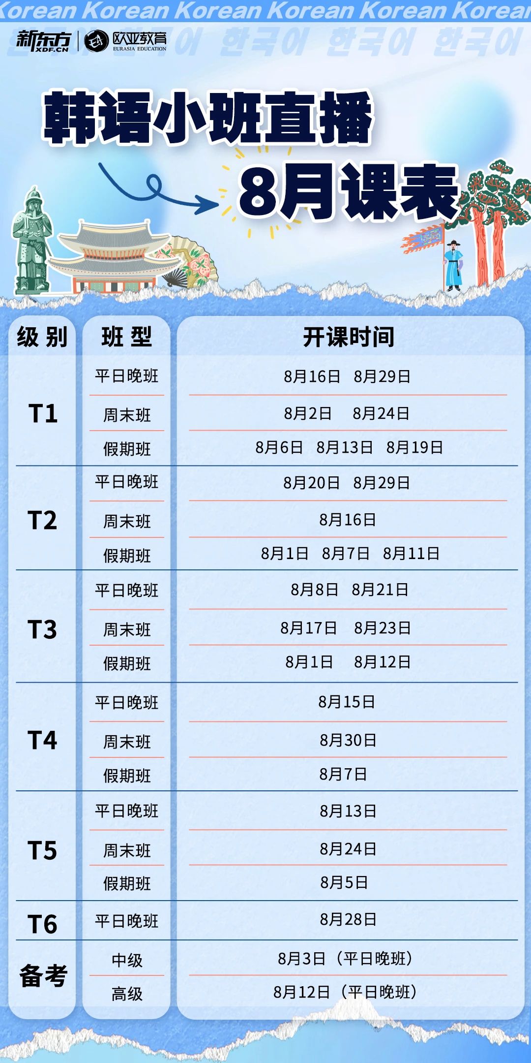 新东方韩语2025年8月直播课表