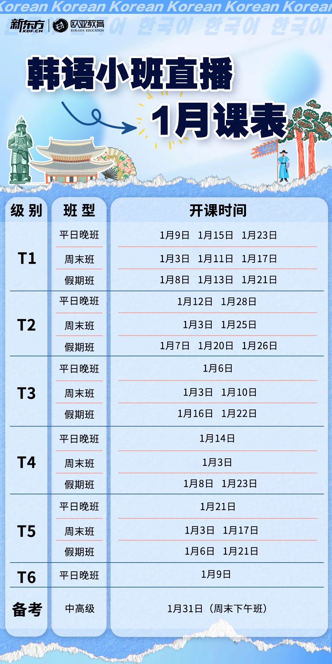 新东方韩语2026年1月直播课表