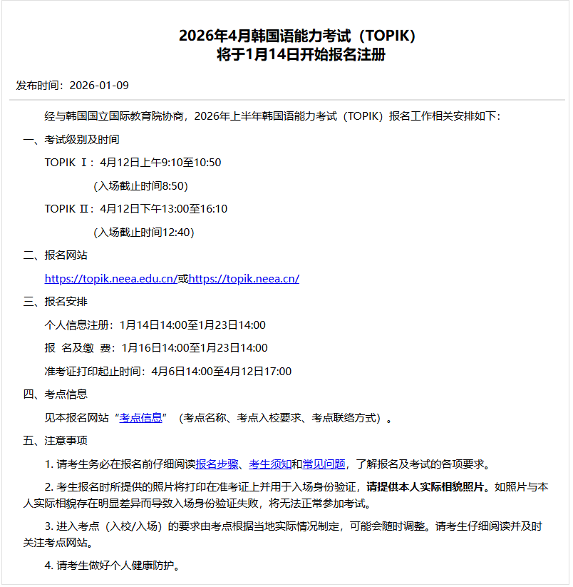 根据教育部教育考试院发布的最新通知,第99届TOPIK考试将于2026年4月12日举行,而报名工作即将在1月14日启动。