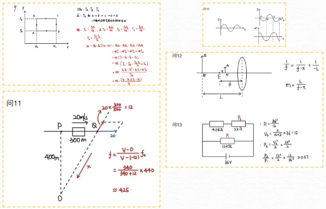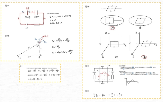 知识点深挖:第1间的求刚体合重心公式(包括立方体倾倒的条件),第8问气体分子平均动能=内能的转换关系,第11问多普勒效应中的速度分解,第12间透镜公式,第14问孤立系统电荷守恒等。