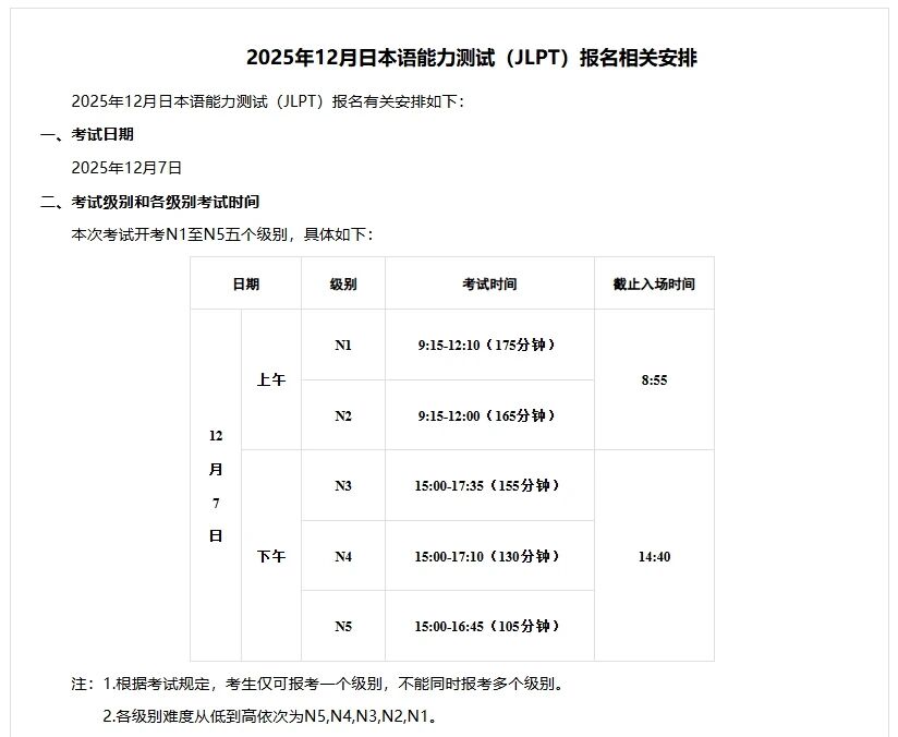 2025年12月日本语能力测试(JLPT)报名相关安排已公布,考试将于12月7日举行,开考N1至N5五个级别,各级别考试时间有所不同。如今,准考证打印通道已正式开启,这对于即将参加考试的考生来说至关重要。