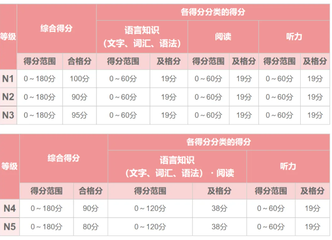 N1~N3与N4・N5得分分类不同。各等级的合格分与及格分如下表所示。
