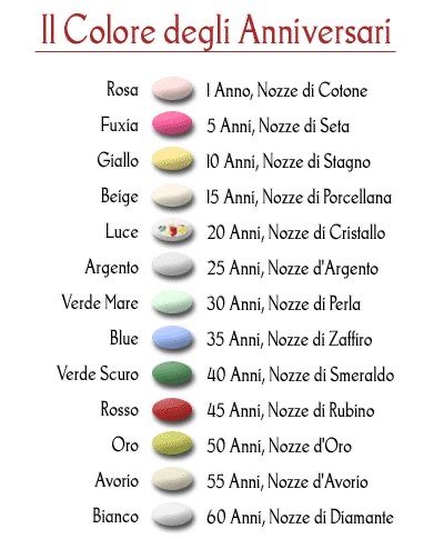 而米色(beige)、黄色(giallo)、象牙色(avorio)、银色(argento)、海蓝色(acquamarina)、绿色(verde)和金色(oro)等颜色的糖果则分别用于庆祝每一个结婚纪念日。(详见下图)