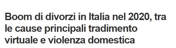 如标题所示,2020年意大利的离婚潮爆发了,最主要的原因有两个,一个是精神背叛,一个是家庭暴力。