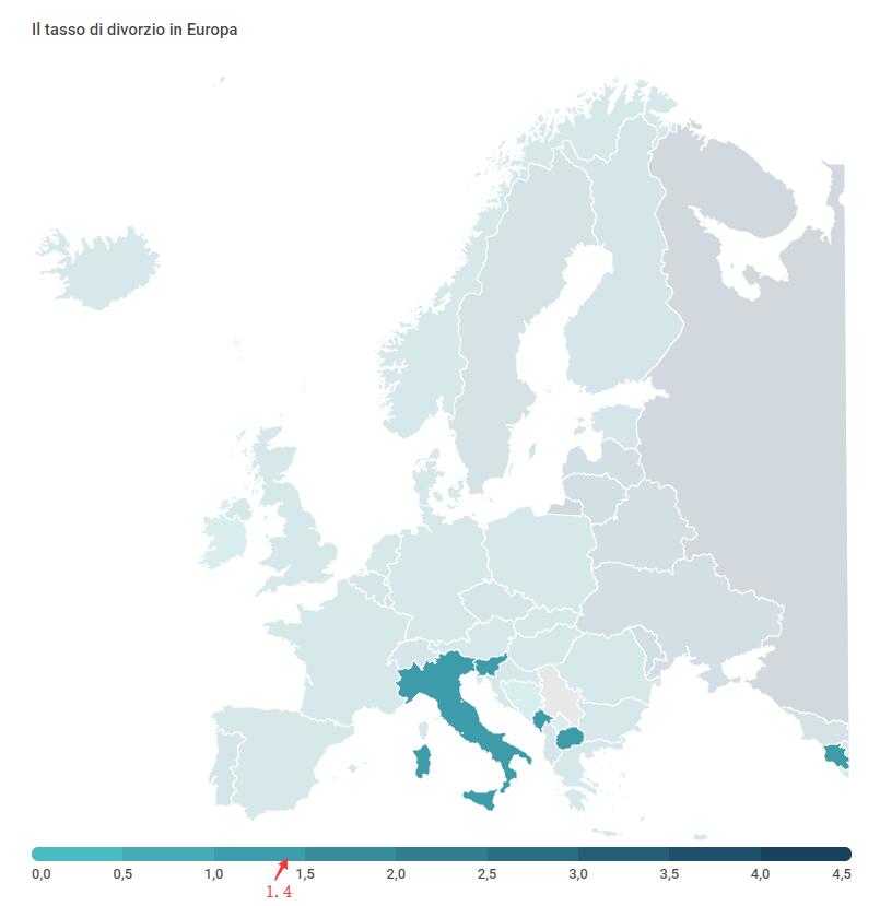 根据近年来欧洲数据库的现实,意大利的离婚率在欧洲大陆并不是最高的。在意大利,每1000个居民中,离婚率是1.4.低于欧盟的平均值1.9.相反,欧洲北部和东欧一些国家的离婚率更是遥遥领先的。比如在拉脱维亚和立陶宛,离婚率高达3.1.白俄罗斯的离婚率达3.4.爱沙尼亚达到2.4.