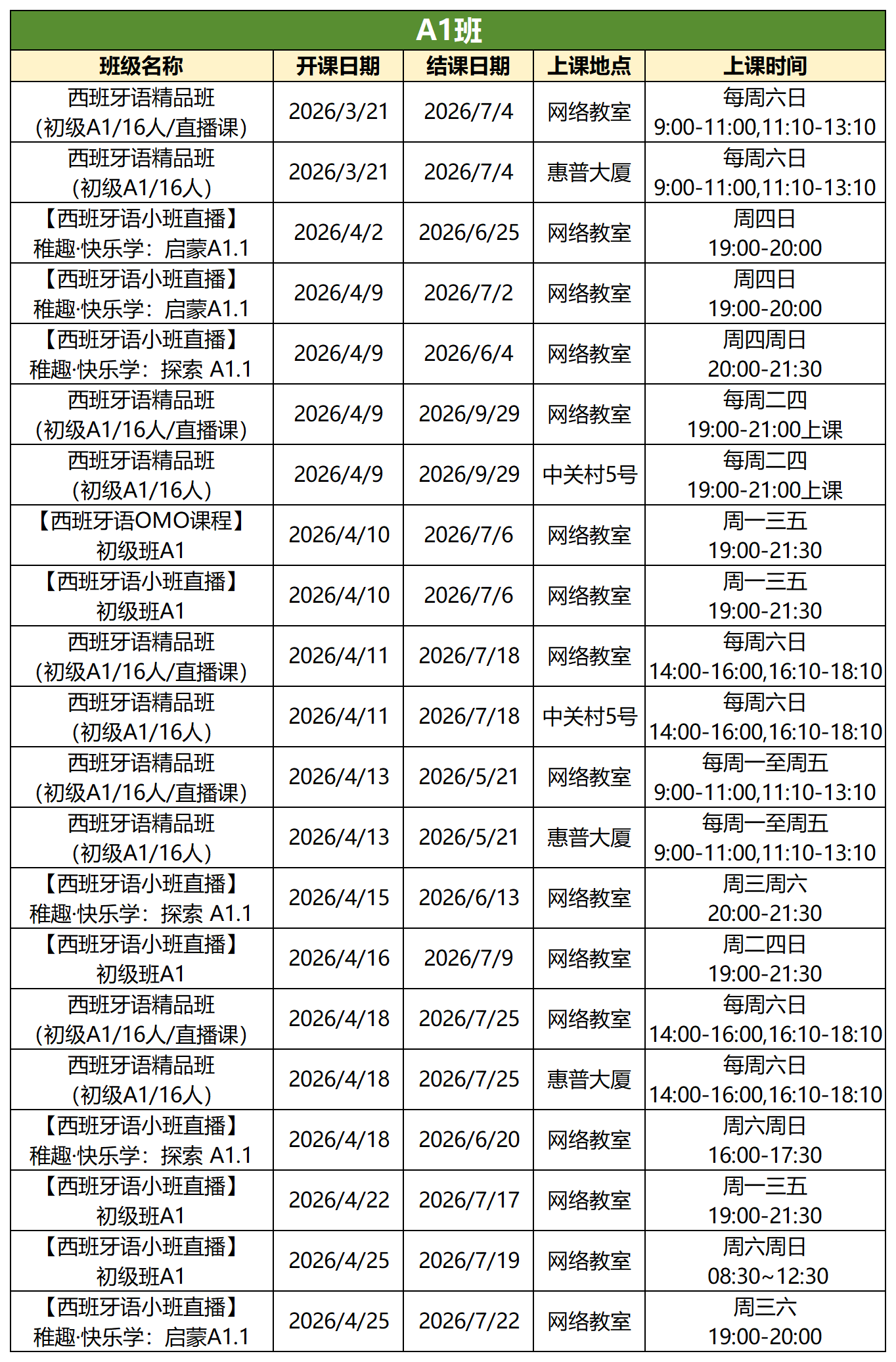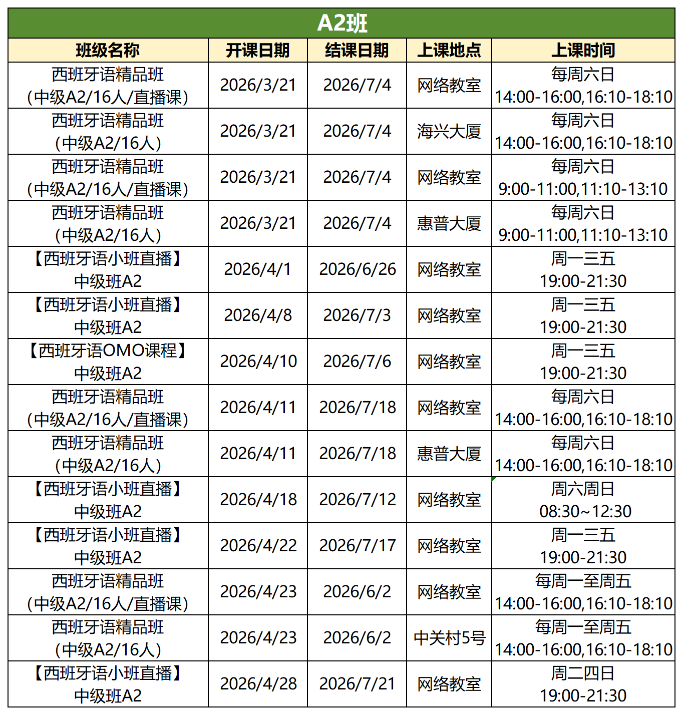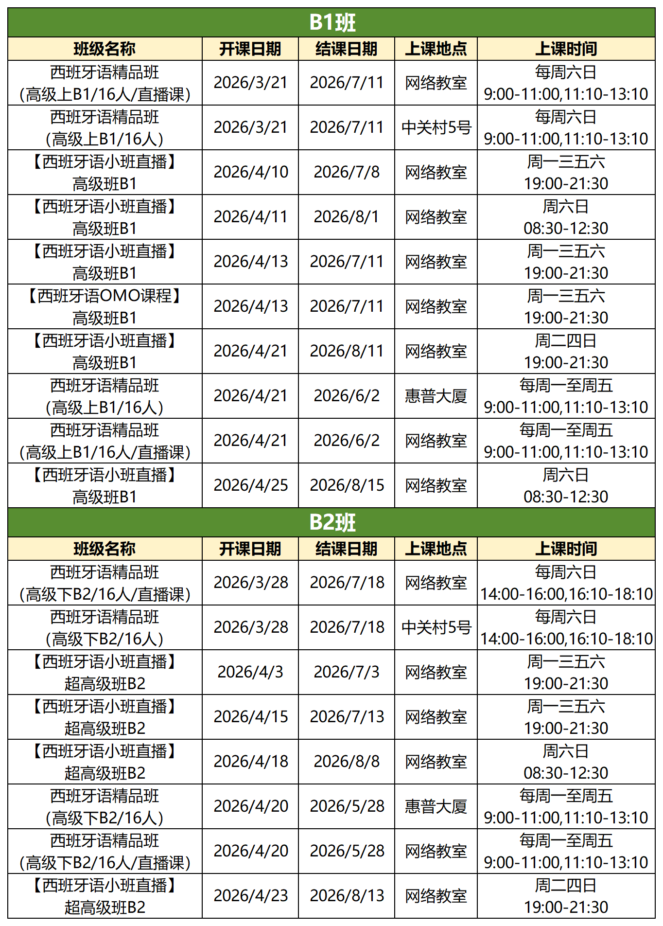我们提供丰富多样的课程班型,线上班、线下班任你挑选,周末班设有单周和双周可选,平日班也有晚班和脱产班供你抉择。无论你心仪何种班型,各个语种、各个级别应有尽有。赶快查看下方详细课表,精准定位最适合自己的学习起点吧!