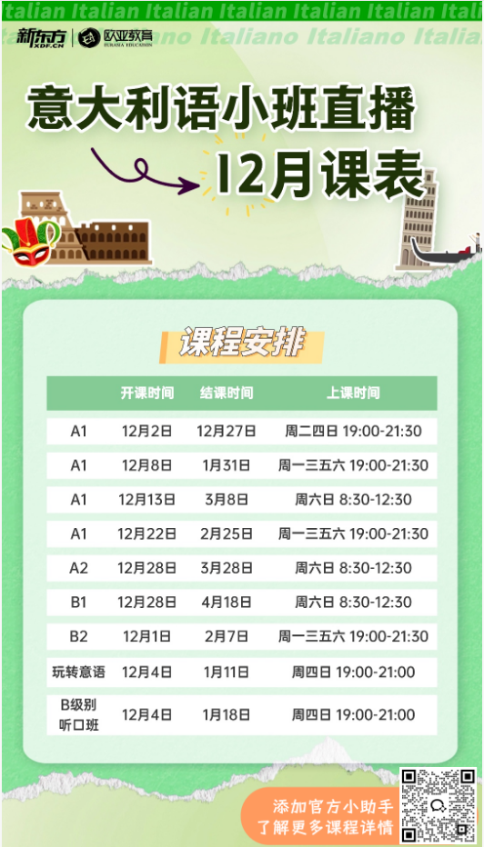如果你对意大利语学习充满热情,想要在这个 12 月开启一段全新的语言学习之旅,那就赶紧行动起来吧!添加官方小助手,了解更多课程详情,让我们一起在意大利语的世界里遨游。