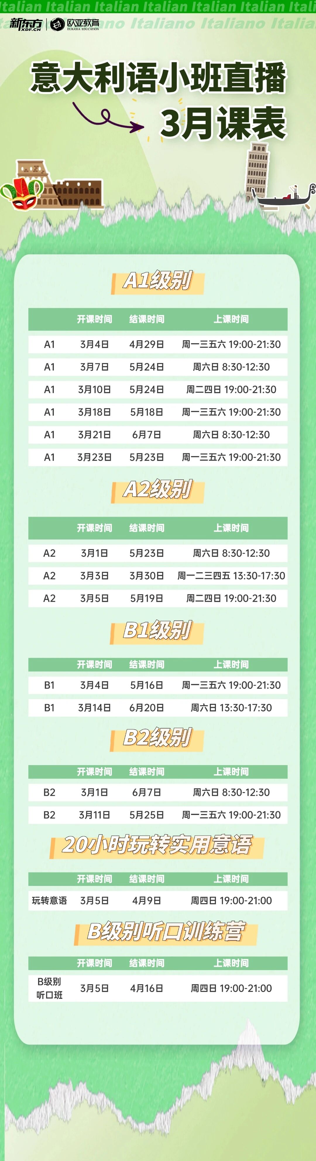 向往意大利的艺术与美食?从这门课开始!2026年3月新东方意大利语直播课开讲,注重发音韵律与场景对话,带你零基础轻松入门,感受意式语言魅力。